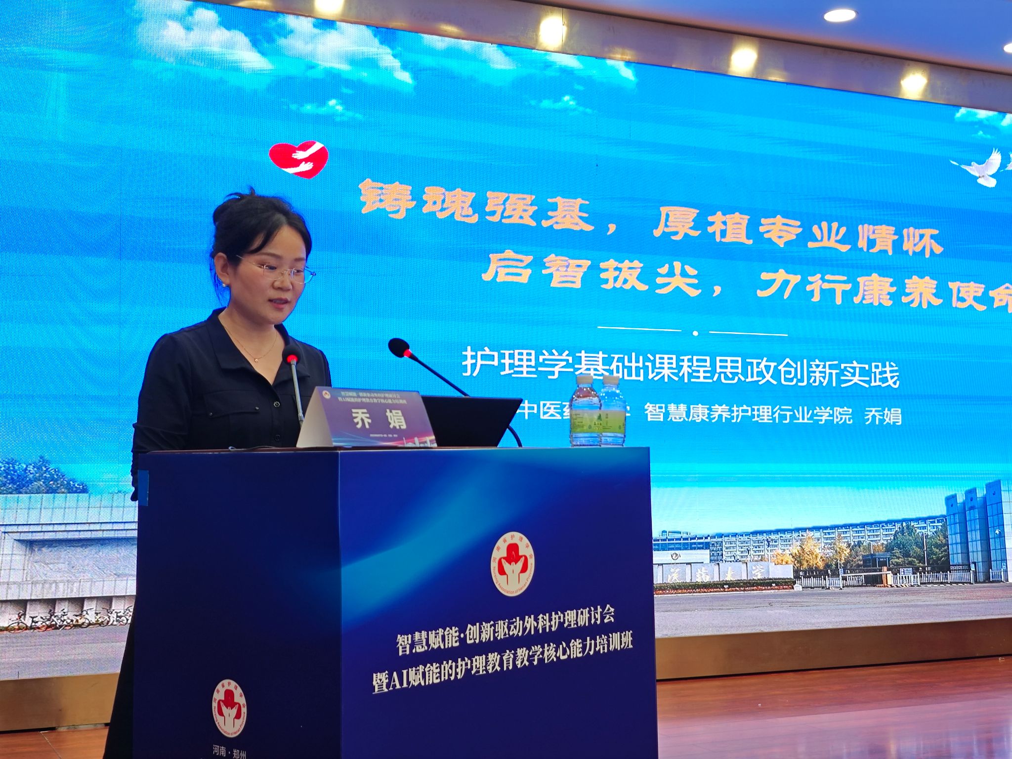 会上,杨巧菊教授作《AI赋能护理教育:教学创新与实践》主题报告,从教育数字化战略行动、生成式AI在护理教育中的应用和AI时代教学的挑战与未来展望三方面展开,报告为护理教育创新提供了理论与实践参考。乔娟老师进行教学创新风采展示,以《铸魂强基,厚植专业情怀;启智拔尖,力行康养使命——护理学基础课程思政创新实践》为题,分享第六届河南省本科高校教师课堂教学创新大赛(课程思政)特等奖成果,为护理专业课程思政建设提供新范式。