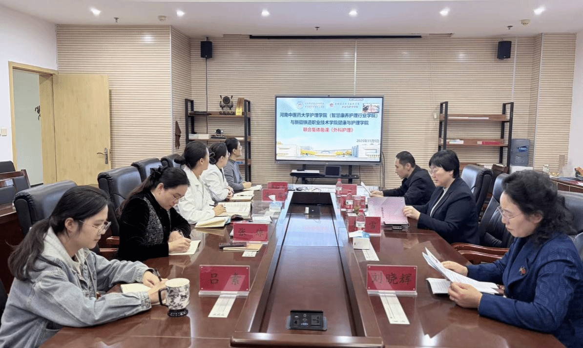 本网讯(文/图 井晓磊)为深入贯彻落实新时代党的治疆方略,推动豫哈教育协作走深走实,11月5日下午,新疆铁道职业技术学院健康与护理学院和河南中医药大学护理学院(智慧康养护理行业学院)通过线上线下相结合的方式,成功举办以《外科护理》课程为核心的第二次联合集体备课活动。活动主会场设于新疆铁道职业技术学院健康与护理学院全息教室,河南中医药大学护理学院设分会场。河南中医药大学党委常委、副校长任献青,社会合作办公室主任赵振营,教务部常务副部长禄保平、副部长李青雅,护理学院全体班子成员及课程组教师;新疆铁道职业技术学院八一路校区管委会副主任史富强,教务处副处长佐合热阿依·斯坎旦,健康与护理学院副院长吴鹏辉、阿衣夏木·夏衣提等领导教师共同参与。活动由河南中医药大学护理学院党委书记牛乐主持。