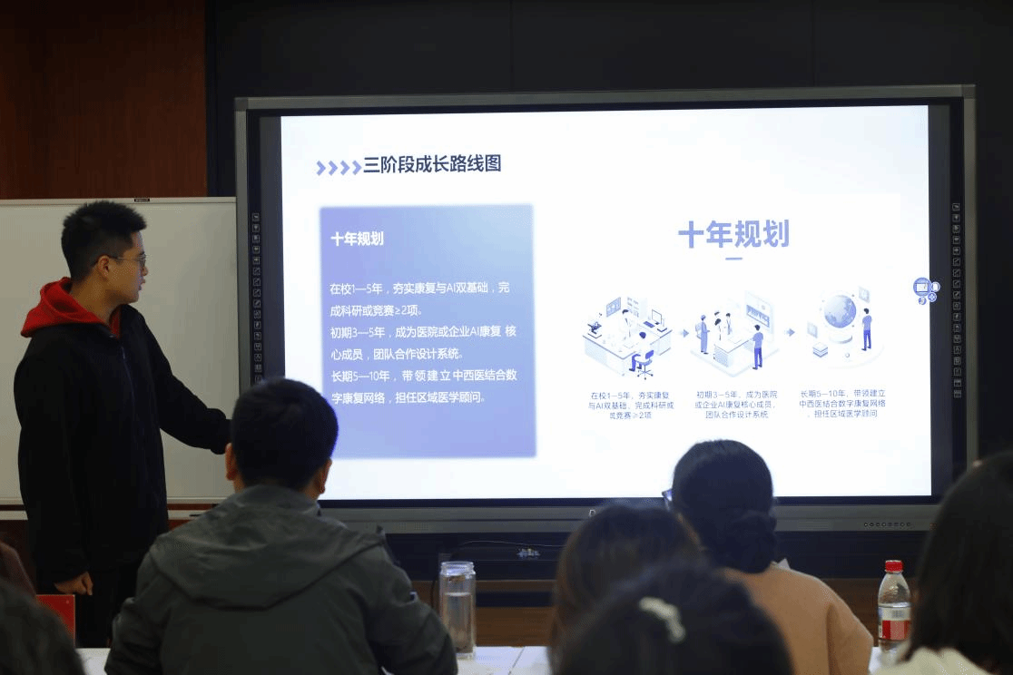 本届大赛以“AI赋能,创意无限”为主题,鼓励选手将AI技术融入创作全流程。经过初赛严格选拔,来自各学院的优秀选手脱颖而出,齐聚决赛现场,展开智慧与创意的最终较量。决赛采用PPT答辩形式,参赛者系统呈现了AI作品的生成路径,重点阐释AI的参与程度、思维逻辑以及人机协作的创新模式。现场思维激荡,选手们借助精美PPT,生动展示了如何借助AI完成初稿生成、文本润色与灵感激发,并深入探讨了在AI辅助下如何坚守作品原创性与思想深度,实现科技与人文的有机共生,呈现一场AI与艺术交融的视听盛宴。