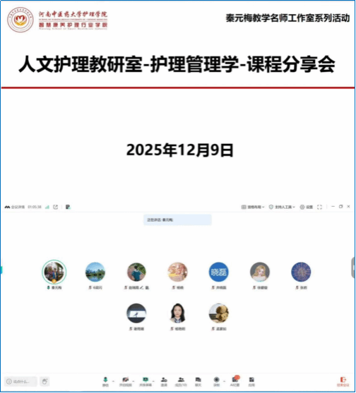 本网讯(文/图 徐碧璇)名师引领促教研,开题试讲共提升。2025 年12月9日晚,河南省高等学校教学名师秦元梅工作室依托腾讯会议平台线上线下顺利开展系列教研活动。名师工作室成员、人文护理教研室成员、研究生和邀请的专家线上参会。会议由护理学院(智慧康养护理行业学院)院长秦元梅教授主持。
