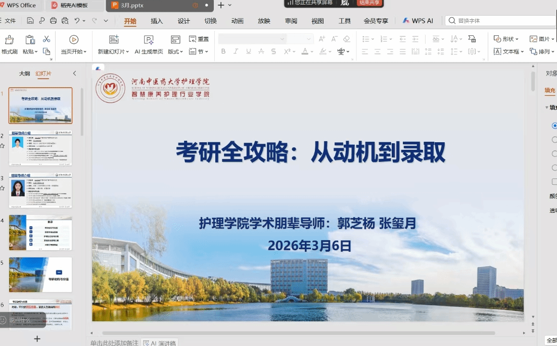 本网讯(文/杨晨羲 图/学习部)为进一步帮助护理学子明确考研目标、优化备考策略,切实解决备考过程中的实际困惑,2026年3月6日,护理学院(智慧康养护理行业学院)通过线上腾讯会议,顺利举办考研经验及备考策略专题分享交流会。本次活动特邀学院研究生学术朋辈导师郭芝杨、张玺月担任主讲,全院有志于考研的本科生齐聚云端,聆听经验、共话成长。