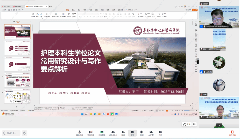 本网讯(图/文 王莉莉)为切实解决2026 届护理专业毕业生在学位论文写作中面临的困惑,提升论文质量与学术研究能力,2025年12月6日晚,护理学院特别邀请阜外华中心血管病医院的王宇老师通过腾讯会议为全体 2026 届毕业生带来了题为《护理本科生学位论文常用研究设计与写作要点解析》的专题讲座。396位学生及部分指导老师线上参会。